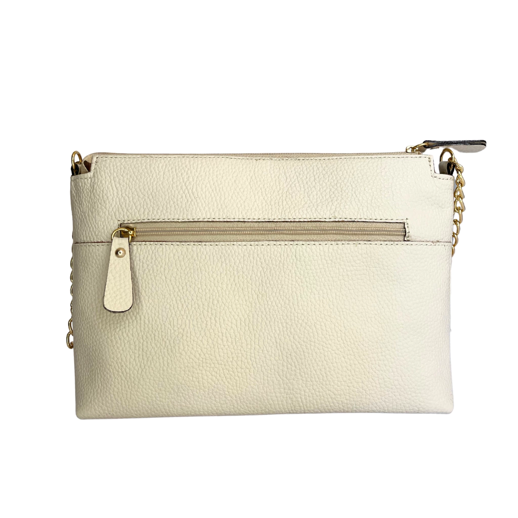 Bolsa em couro legítimo, tamanho médio e ferragens personalizadas douradas Sueldo's em banho triplo especial. O modelo oferece alça longa regulável na sua maior parte em couro e também em corrente dourada. Com a alça longa regulável é possível ajustar a altura para usar a bolsa no ombro ou transversal. Abertura da bolsa por zíper , na parte interna oferece dois bolsos sendo um simples e outro com zíper. Externamente tem um bolso na parte de atrás.