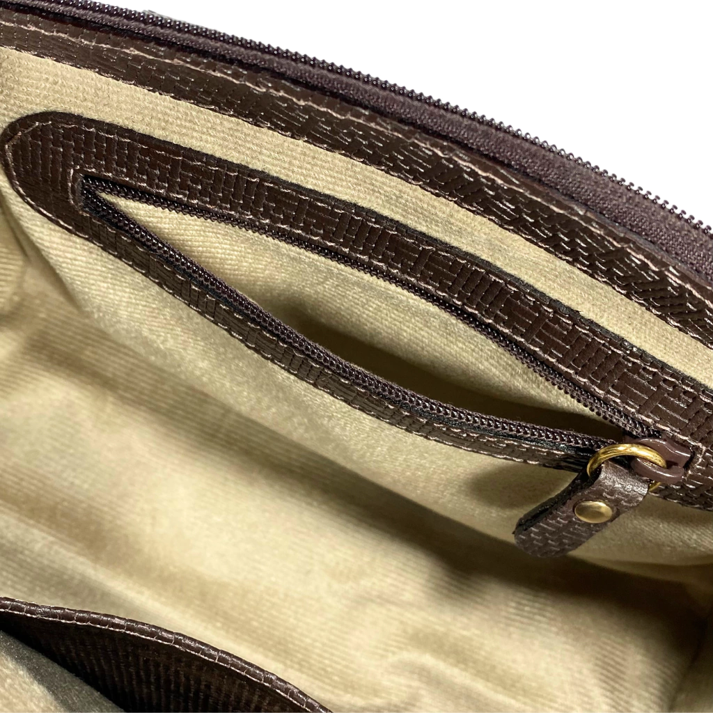 Bolsa Sueldos em couro legítimo, de tamanho pequeno e fechamento por zíper. O modelo permite uso da bolsa na mão, antebraço e tiracolo, através da alça extra regulável e removível. Com os botões laterais desabotoados, a abertura da bolsa é ampla permitindo excelente visão interna. Dentro temos 2 bolsos, sendo um simples e outro com zíper.