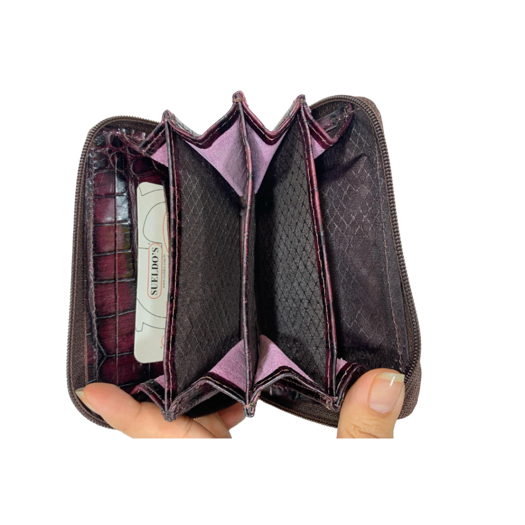 Carteira Sueldos em couro legítimo, de tamanho pequeno e fechamento por zíper. Internamente oferece 3 bolsos para cartões de crédito e divisórias para melhor organização. Possui atrás bolso porta moedas com zíper.